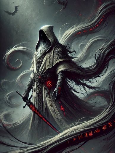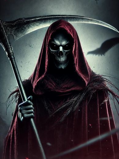 His face is a haunting visage, marked by a skull-like appearance that emphasizes his role as a harbinger of death. From beneath a dark hood, shadows play across his features, creating an air of mystery and foreboding.