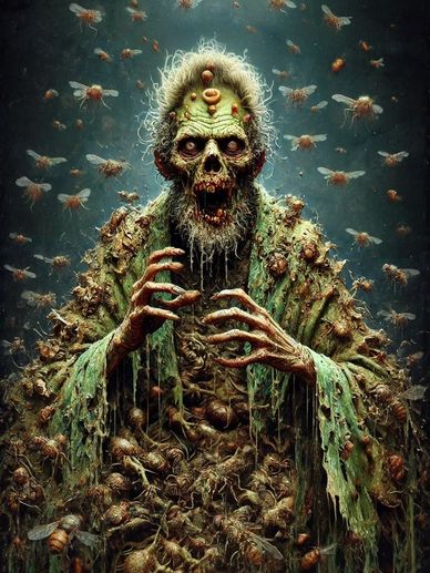 His skin is a sickly hue, marked by patches that resemble decay, and his features are exaggerated—sharp teeth gleam in a twisted smile, and his eyes are deep-set, glowing with an unsettling light that reveals his insatiable appetite for chaos. Beelzebub's movements are fluid and unsettling, almost insect-like, as he weaves through the shadows, always accompanied by a swarm of vile insects that buzz and writhe around him.