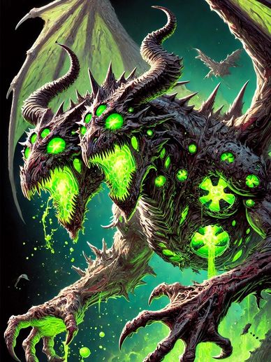 In addition to his fiery breath, Lynnor's other head can spew a noxious acid. This vile substance, a bubbling greenish-yellow liquid, drips from his fangs before being launched at his foes in a powerful spray. The acid sizzles as it makes contact with surfaces, corroding armor and flesh alike, leaving a trail of sulfuric destruction in its wake.