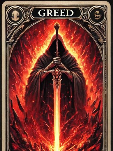 Greed is a powerful and sinister sword that embodies the insatiable desire for wealth and power. The blade is forged from a dark, lustrous metal, with intricate engravings that shimmer ominously, hinting at its corrupting influence. Its edge is razor-sharp, capable of cutting through both flesh and resolve, reflecting the destructive nature of avarice.